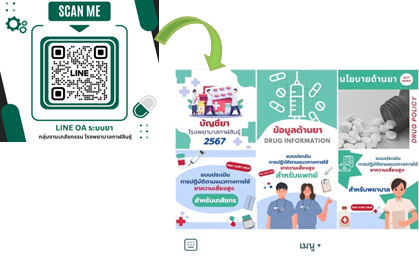 พร้อมเข้าถึงผ่าน Application Line OA ซึ่งประกอบไปด้วยข้อมูลสำคัญต่างๆเช่น บัญชียาโรงพยาบาลกาฬสินธุ์ปี 2567 , ข้อมูลขนาดยา/การเตรียม บริหารยา , นโยบายด้านยา สามารถ Scan